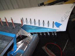 The forward edge of the siffeners must be trimmed so they will come close to the spar (but not too close). I've marked reference lines on the skins so the trimmed stiffeners can be placed.
